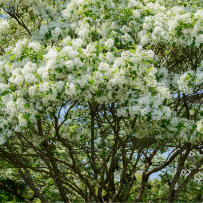 The Chinese fringe tree is a small to medium-sized deciduous tree known for its spring blooms, leathery leaves, and peeling bark. It produces fragrant, white, star-like flowers with thin petals after its leaves emerge, which contrast with the glossy, deep green leaves that turn yellow in the fall. It prefers full sun but tolerates some shade.